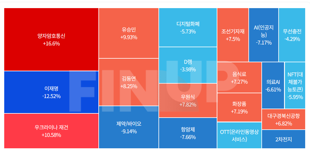오늘 시장은 좋지 않은 흐름 속에서 우크라재건 테마주와 대선 관련테마주가 상승을 보였고