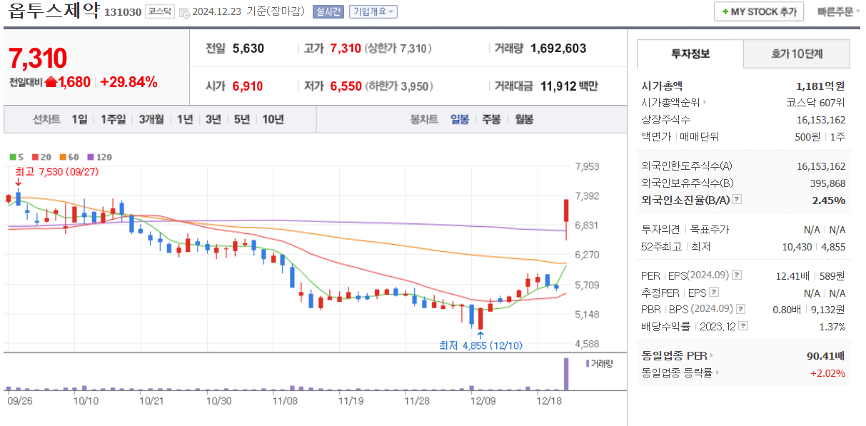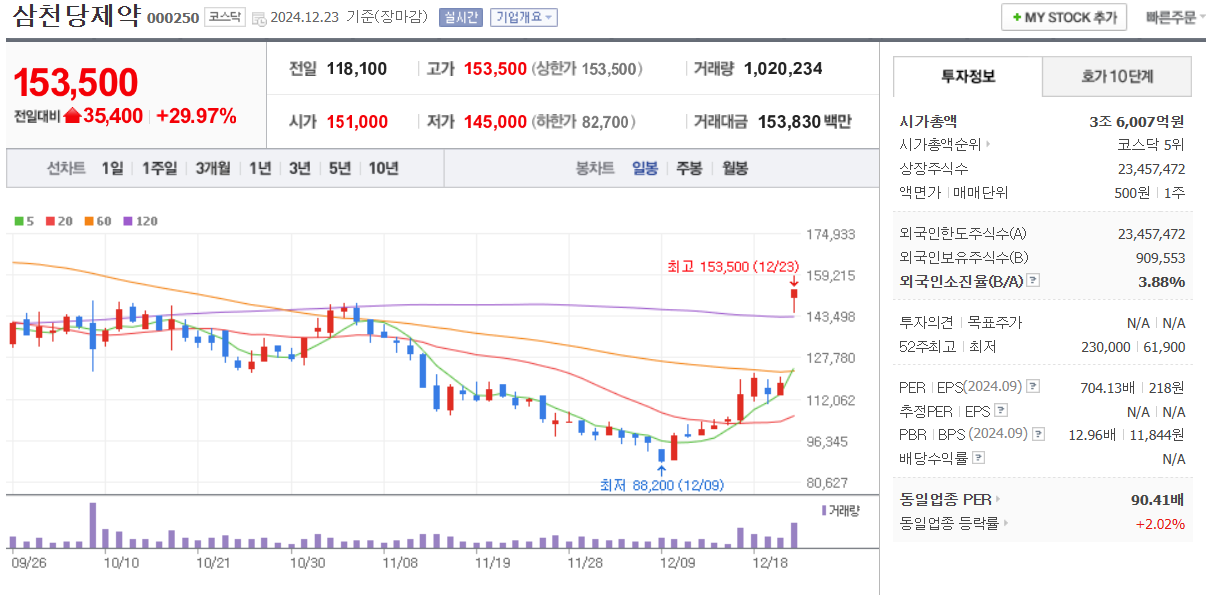 치료제의 개발, 생산, 판매를 하고 있습니다. 오늘 삼천당 제약과 마찬가지로 갭상승 출발해서