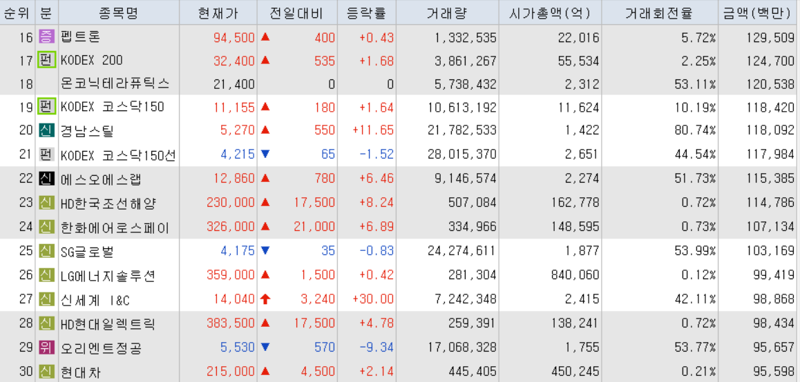 시가총액 상위 종목에서는 대부분 상승을 했고 기아,네이버 종목이 하락을 했습니다.