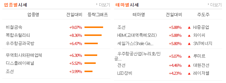 보였고 우주항공 관련주도 상승 보였습니다. HBM 관련주도 다시 주목을 받으며 크게 상승했습니다.