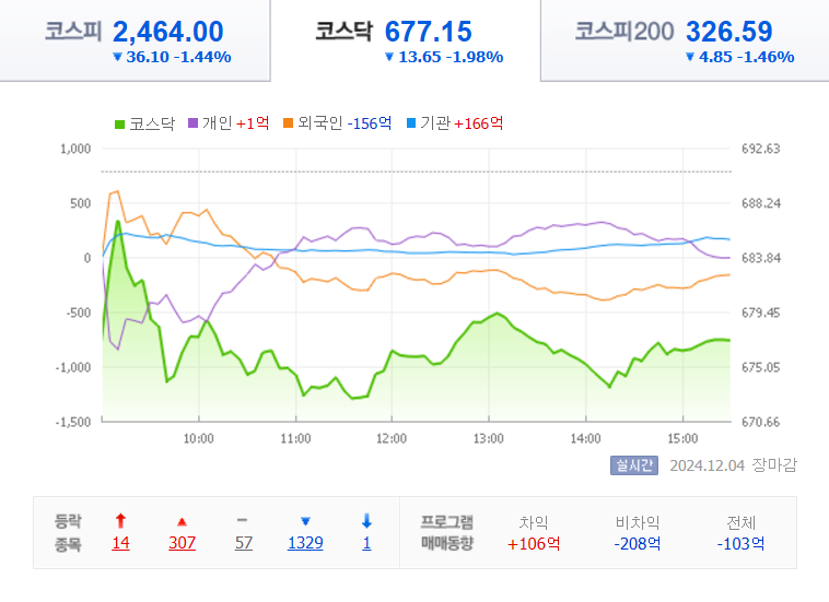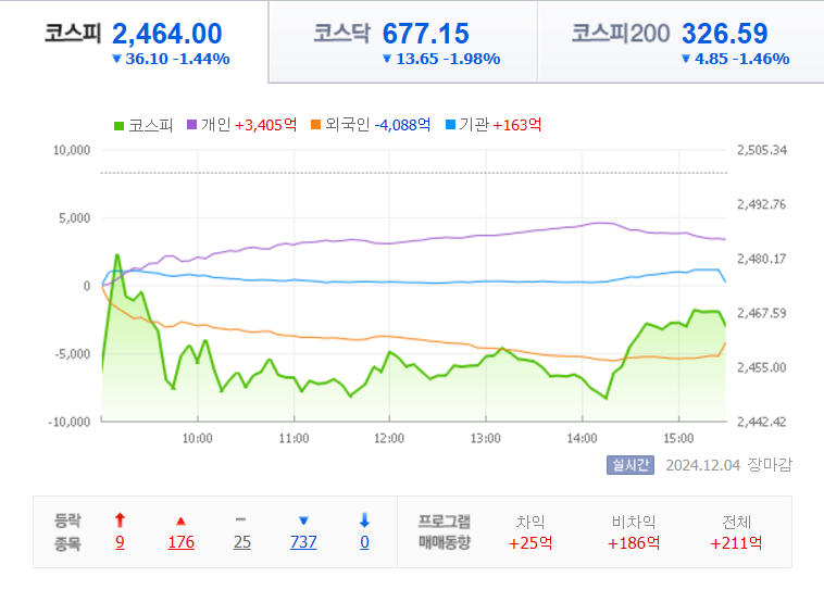 오늘 코스피 지수는 어제저녁 대통령의 긴급 비상계엄 선포이슈가 나오면서 크게 하락 마감했습니다.