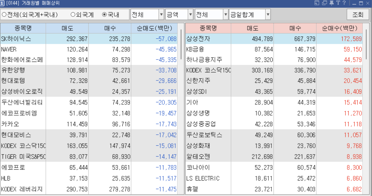 오늘 시장에서는 대부분 하락을 했는데 외국계서는 반도체, 우주, 인터넷, 엔터, 2차 전지까지 다양한