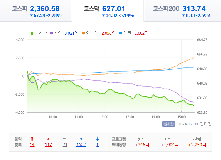 오늘 시장에서는 탄핵을 맞아서 양지수 모두 큰 폭으로 폭락을 했고 탄핵에 실패를 했지만 윤대통령 탄핵