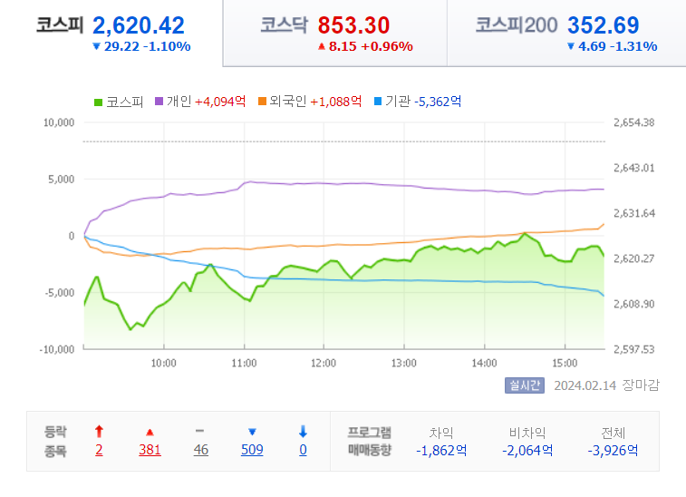 전날 대비 29.22p(1.10%) 하락한 2620.42로 장을 마쳤습니다.