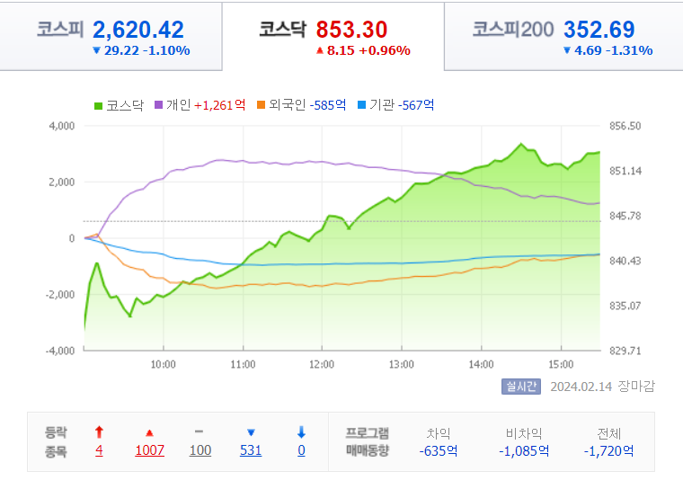 외국인 기관이 각각 585억 원 , 567억 원 매도룰 했고 개인만이 1261억 원 매수를 하며 지수 상승을