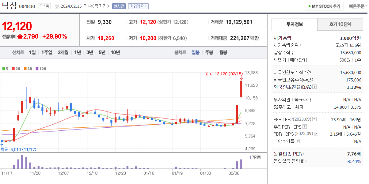 이종목은 덕성보다 크게 갭상승하여 하락에서 다시 상한가 마감을 했지만