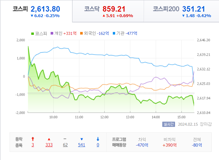 코스피는 전 거래일 대비 6.62p(0.25%) 내린 2613.80에 마감을 했습니다.