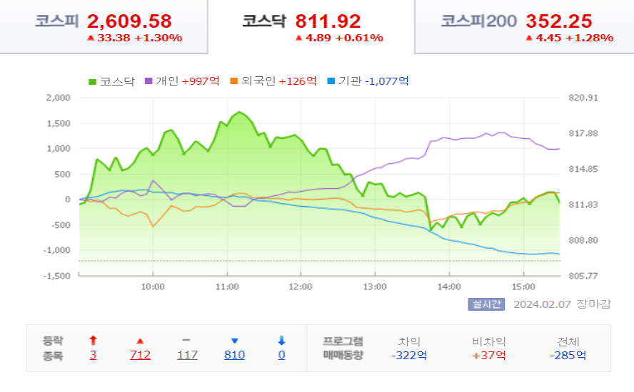 코스닥 지수는 전 거래일보다 4.89p(0.61%) 오른 811.92에 장을 마감했습니다.