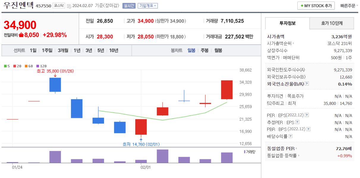 상한가 이유는 특별히 없는 듯 보이고 이종목은 유동주식수가 적은데도 불구하고