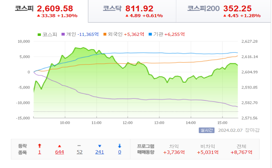 코스피는 전 거래일보다 33.38포인트(1.30%) 오른 2609.58로 장을 마쳤습니다.