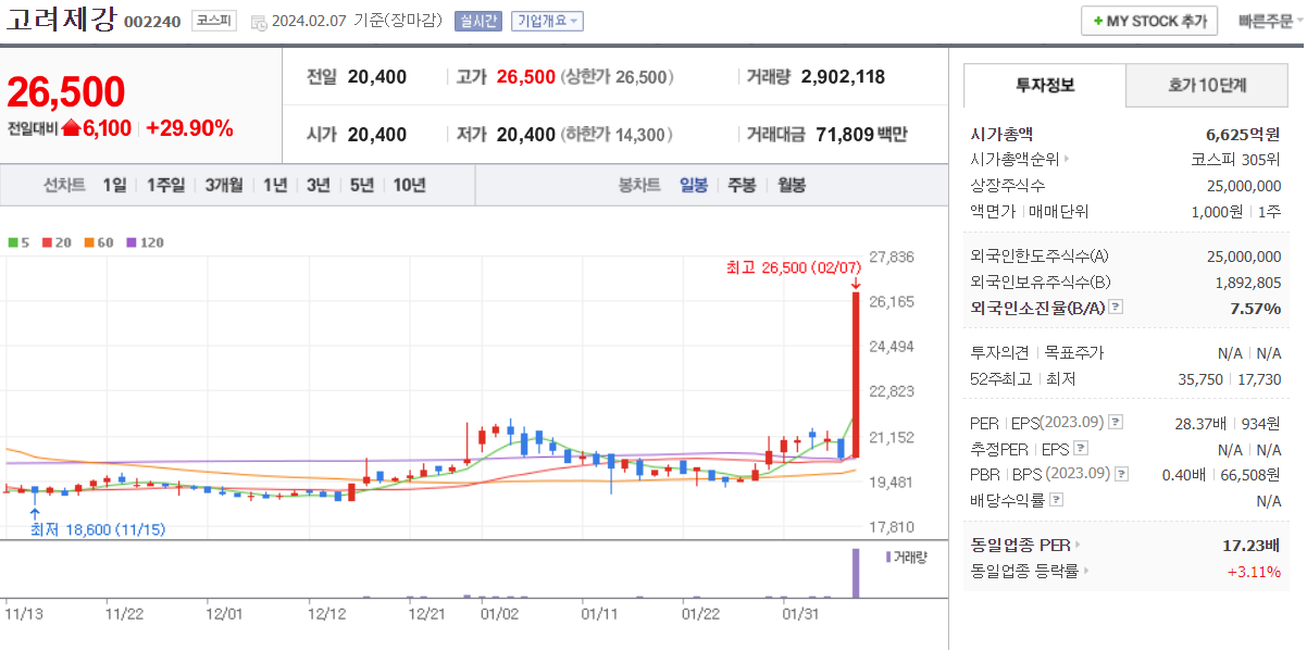 상한가 이유로는 기존 초전도체 테마와 함께 오늘 고려제강 이슈와 동반 수급이 몰리면서