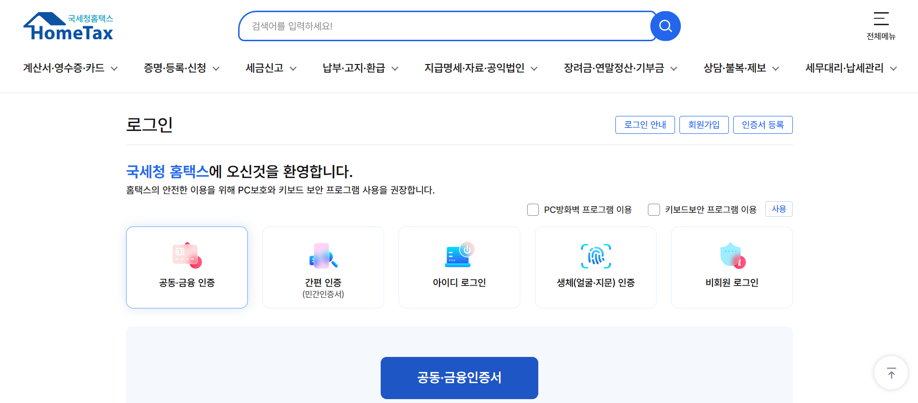 인증서가 없으시면 간편 인증서를 네이버, 토스, 카카오 등을 통해 간편 인증서를 발급받아서 로그인합니다.