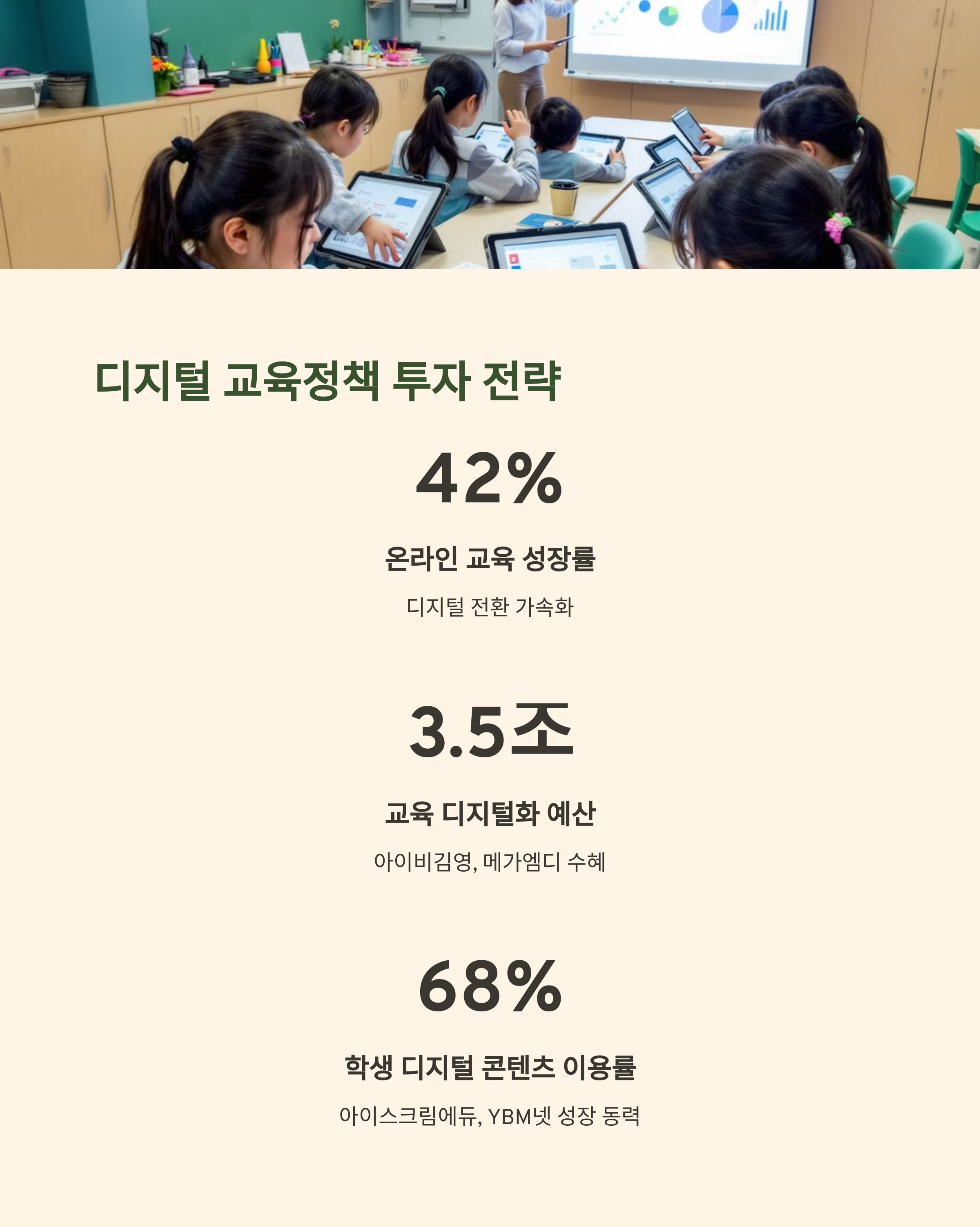 | 교육정책 테마주 | 아이비김영, 메가엠디, 아이스크림에듀, YBM넷 | 디지털 교과서, AI 기반 교육 강화, 온라인 시험 시장 성장 |