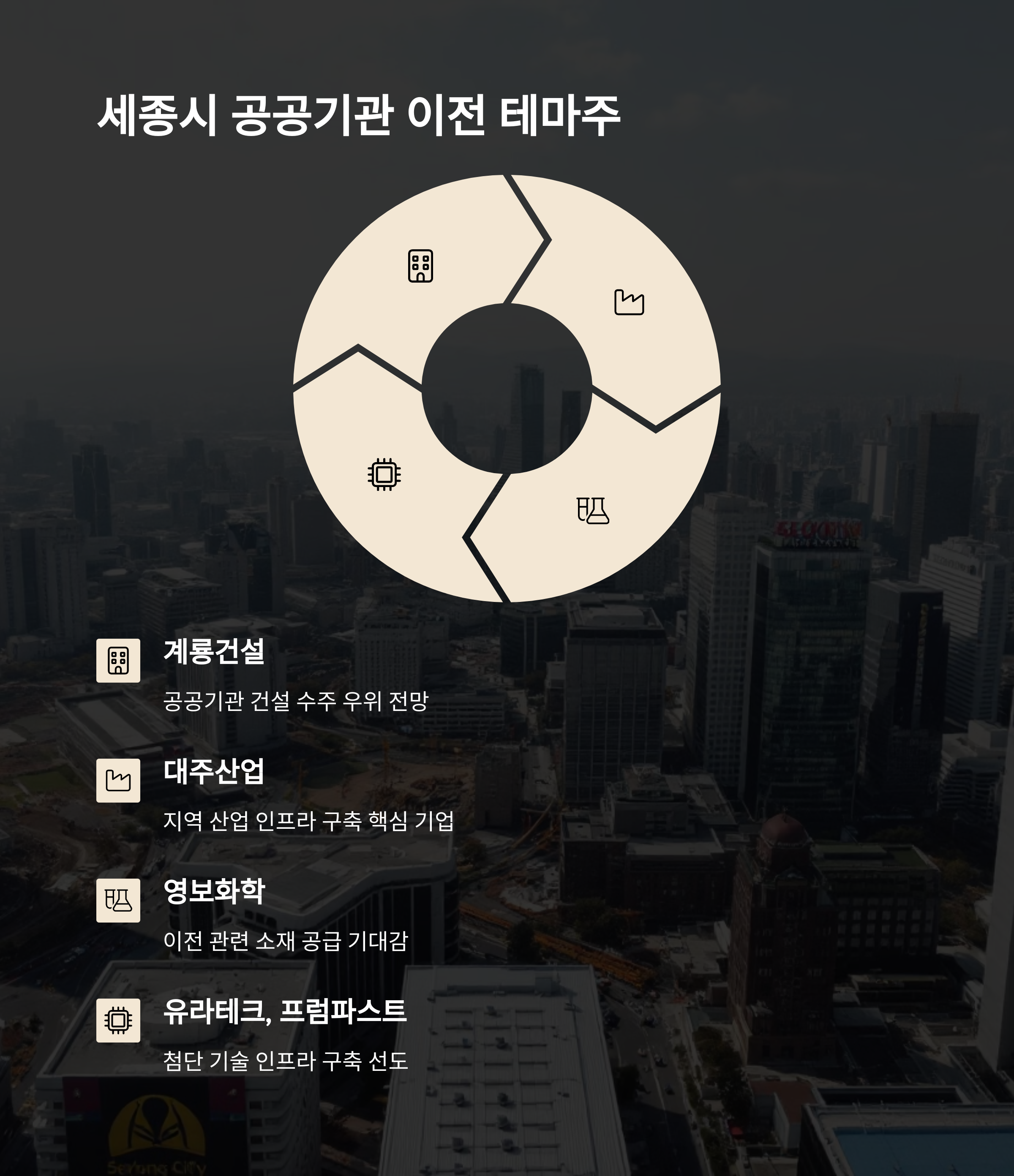 | 세종시 이전 테마주 | 유라테크, 계룡건설, 대주산업, 프럼파스트, 영보화학 | 2차 공공기관 이전, 지역 개발 |