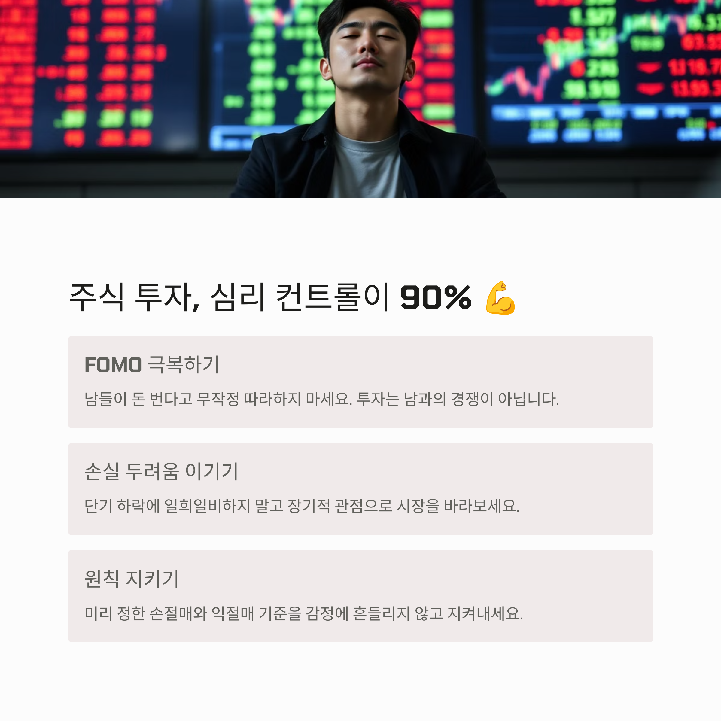 뉴스, 기업 공시, 경제 흐름, 금리와 환율 등을 꾸준히 체크하세요. 투자에 대한 공부 없이 시세만 보는 것은 도박과 다름없습니다.