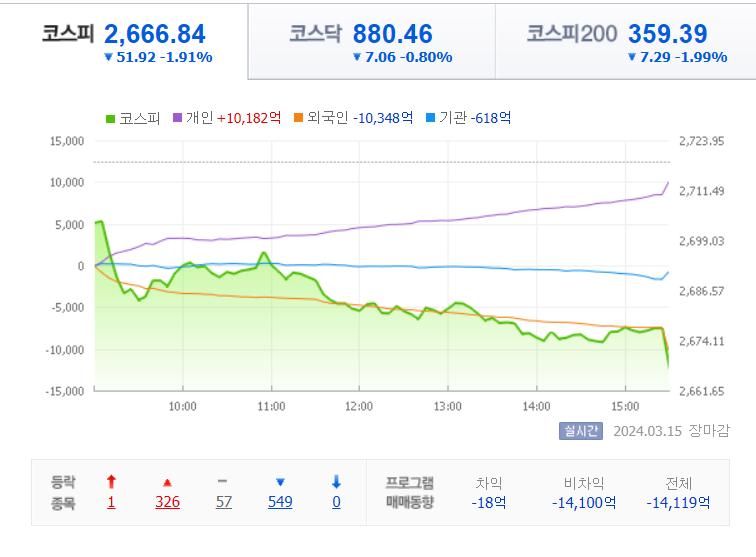 코스피 지수는 전일 대비 51.92(1.91%) 하락하면서 2666.84로 마감을 했습니다.