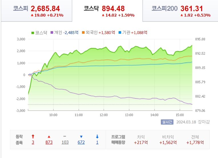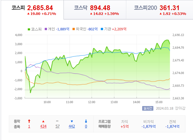 오늘 코스피 지수가 하루 만에 반등에 성공을 하면서 19.00(0.71%) 오른 2685.84에 마감을 했습니다.