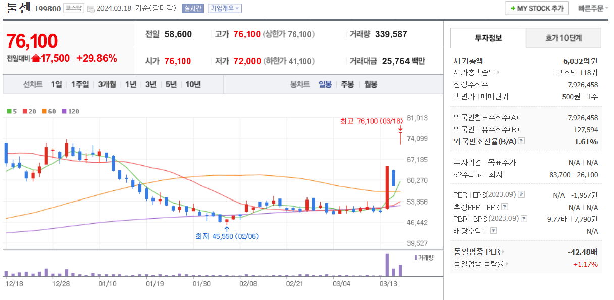 2 거래일 전 상한가 마감을 하고 전일 하락 마감 후 오늘 다시 점 상한가 마감을 했습니다.