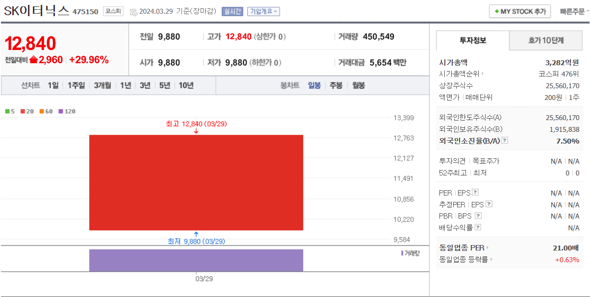 차트는 오늘 하루라서 분석은 어렵고 상장주식수 대비 오늘 적은 거래량과 함께 상한가 마감이