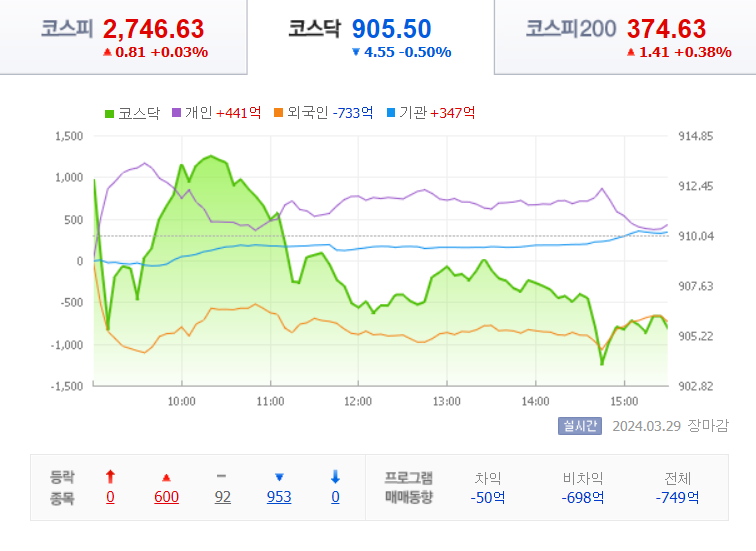 코스닥 지수는 전날 보다 4.55(0.5%) 내린 905.50으로 마감을 했습니다.