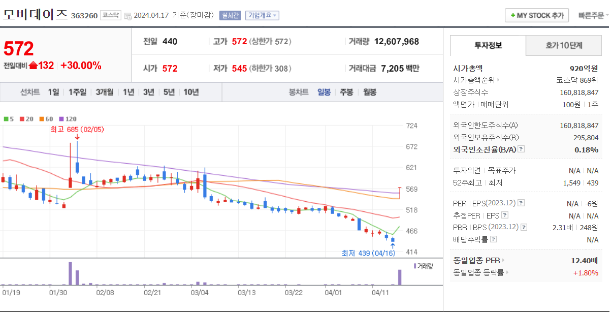 이종목은 신규 상장주로 상장 첫날 고가를 시작으로 계속 하락하다가 오늘 반등 상한가 마감을 했습니다.