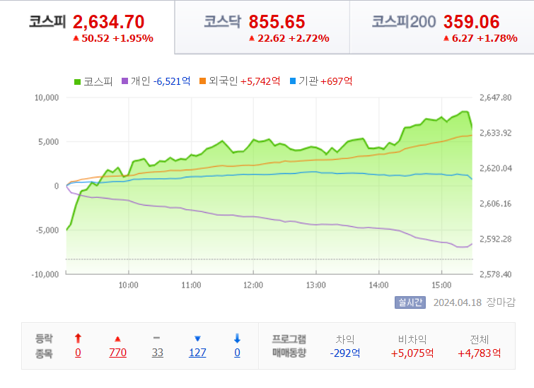 코스피 지수는 전날 보다 50.52(1.95%)상승한 2634.70으로 마감을 했습니다.