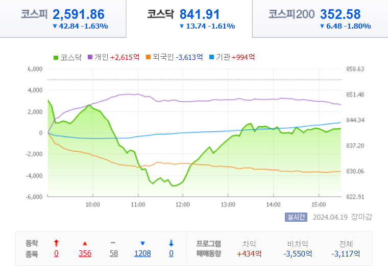 코스피 지수는 전날 보다 42.84(1.63%) 하락한 2591.86으로 마감을 했습니다.