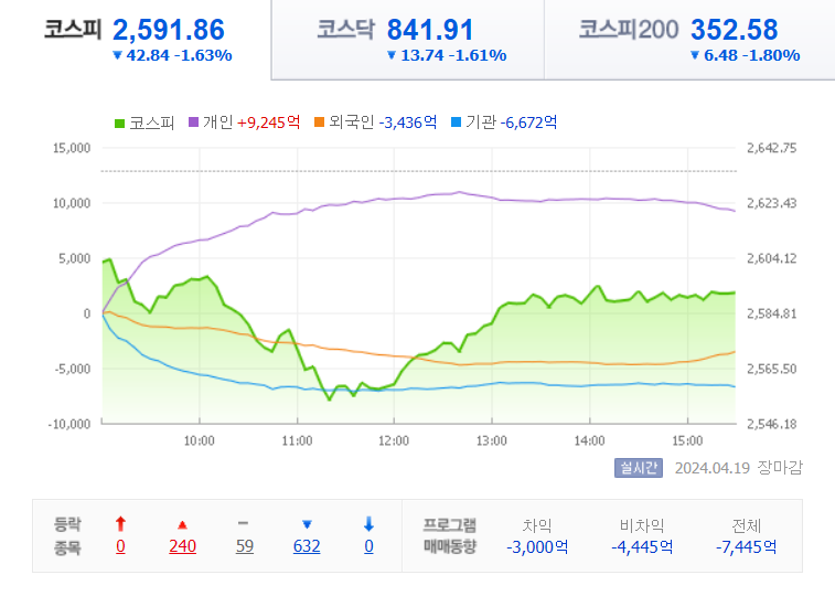 오늘 코스피 지수는 미증시 금리인하 후퇴와 이스라엘 보복 공격 개시 영향으로 큰 폭으로 하락 마감했습니다.