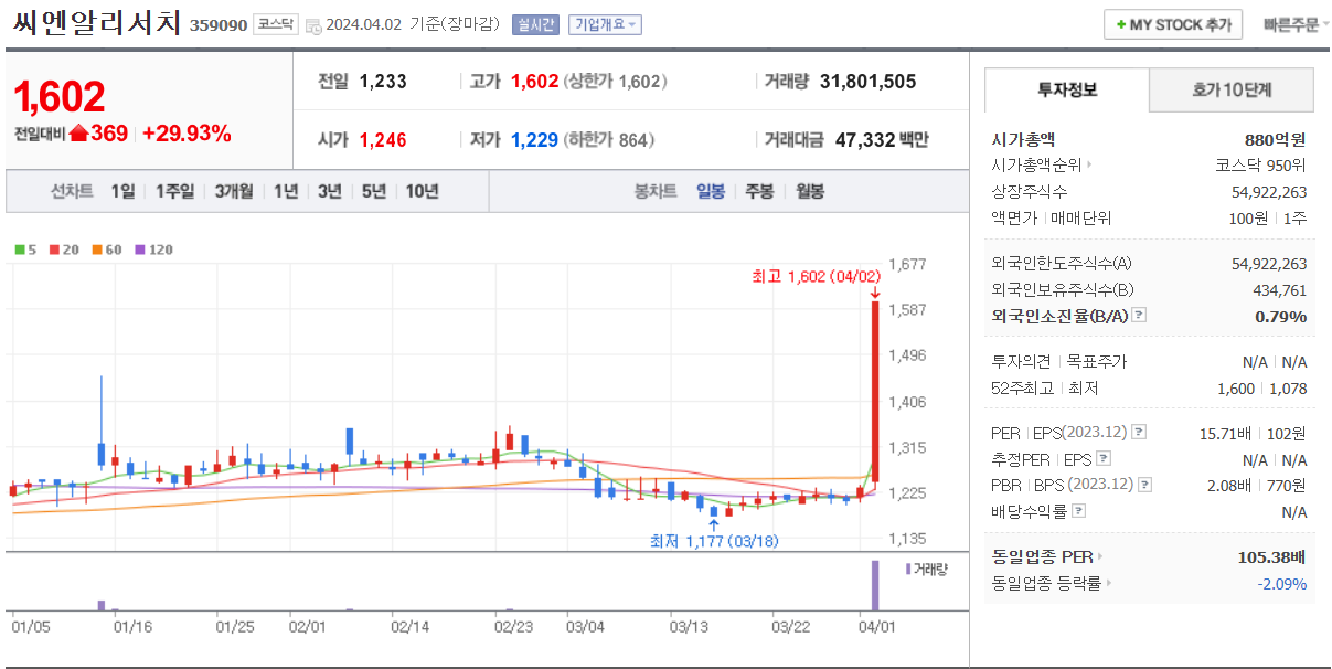거래대금이 시총을 넘어서면서 상한가 마감을 했습니다.