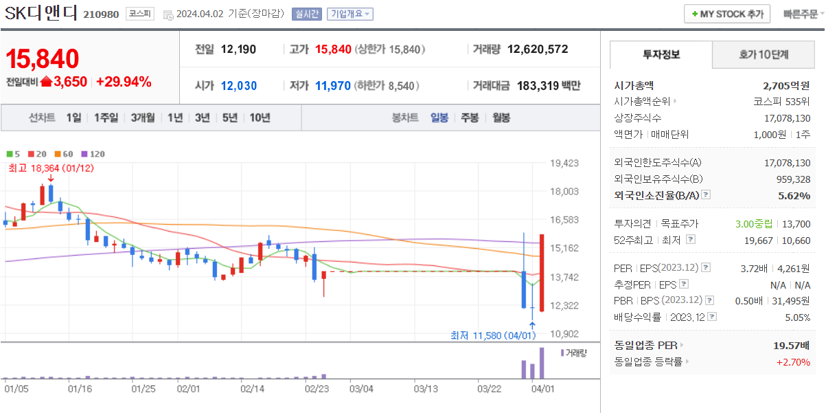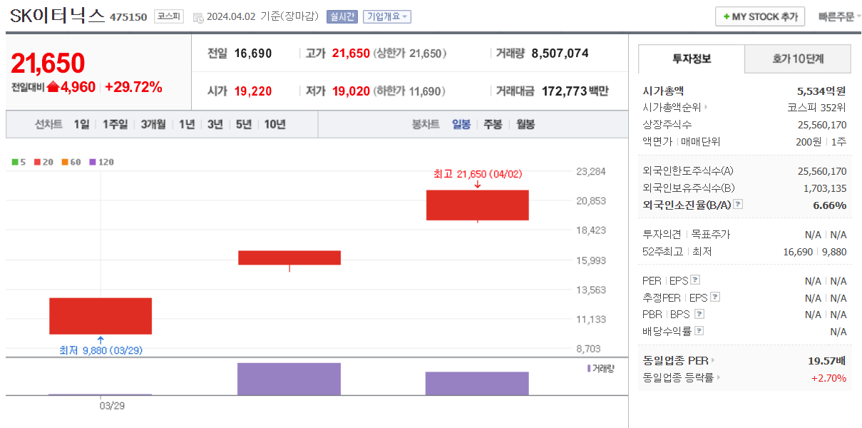 SK이터닉스가 연속 상한가를 가면서 이종목이 주목을 받았는지 모르지만