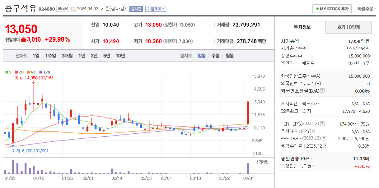 기대감과 중동지역 분쟁이 다시 이슈와 되면서 수급과 함께 상한가 마감 한 것으로 보입니다.