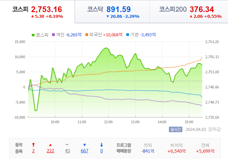 코스피 지수는 전날보다 5.71(0.21%)오르면서  2753.57로 마감을 했습니다.