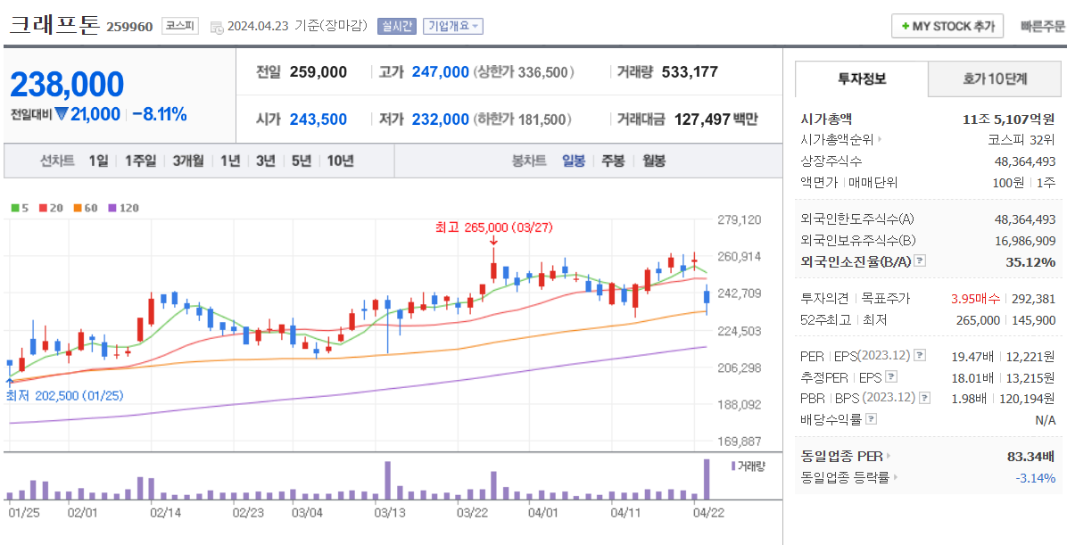 이종목은 우리나라 대표 게임주로 배틀그라운드를 로 유명한 회사입니다.