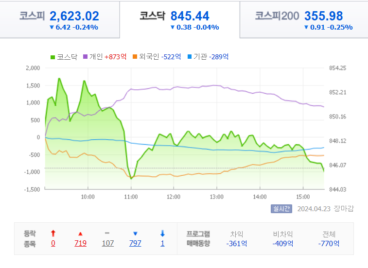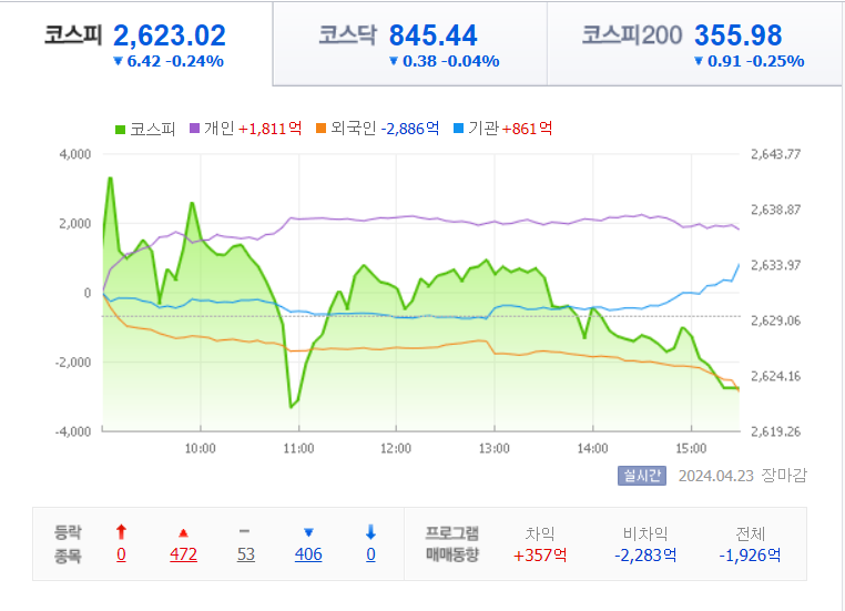 코스피 지수는 전날 보다 6.42(0.24%) 하락하면서 2623.02로 마감을 했습니다.
