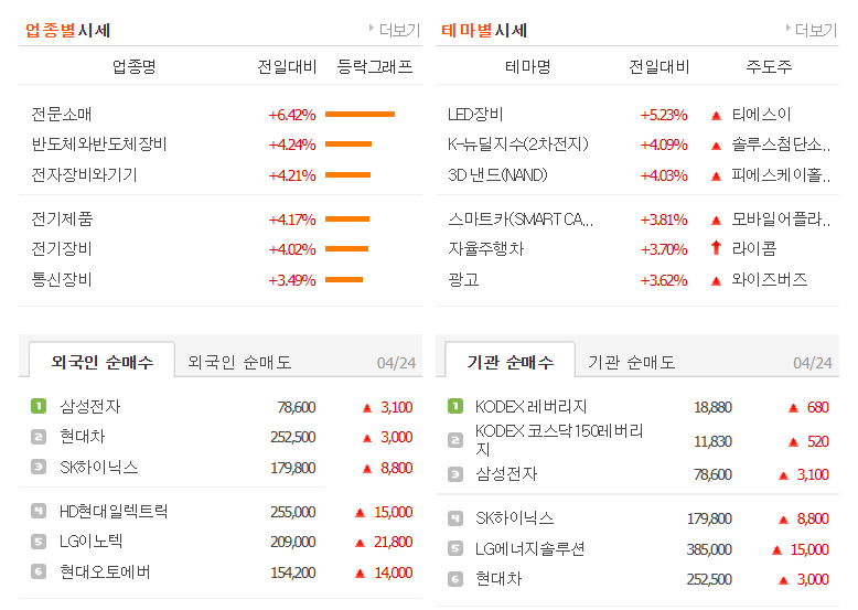 수급 상위 종목을 보면 반도체 섹터가 있고 2차 전지 섹터, 전력 관련주가 있네요.