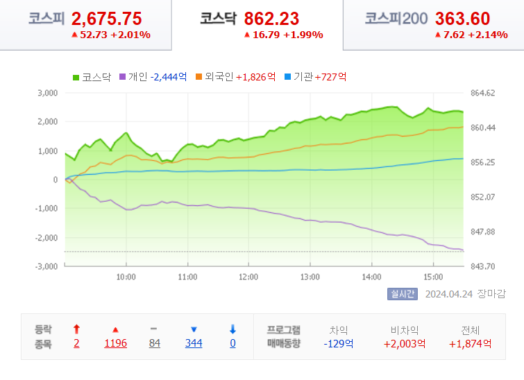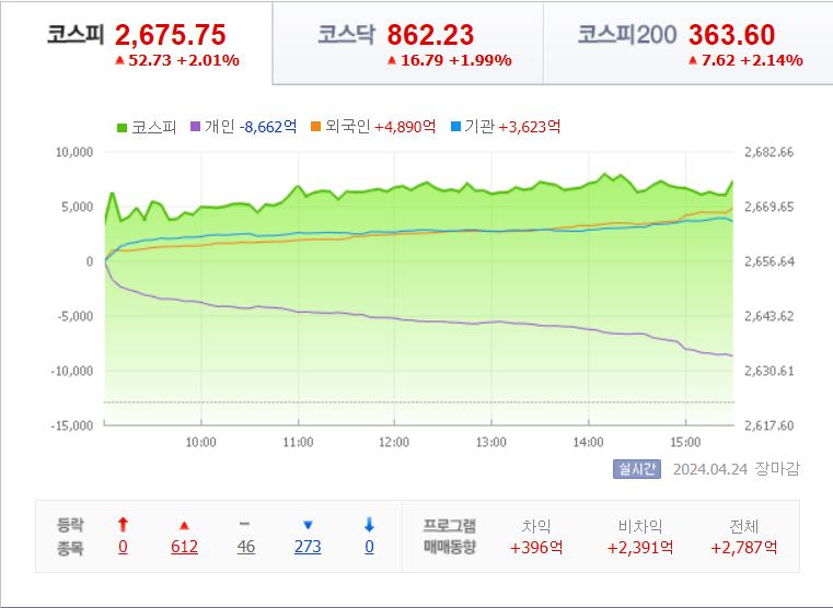 코스피 지수는 전날 보다 57.73(2.01%) 상승하면서 2675.75로 마감을 했습니다.
