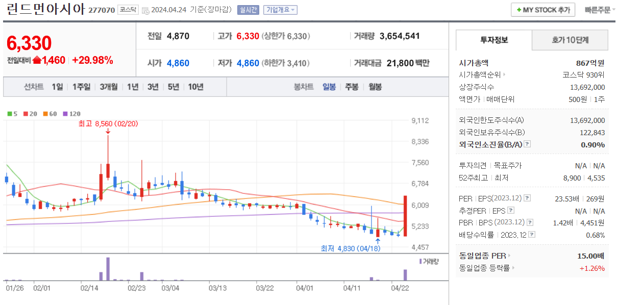 개별이슈 - 린드먼아시아(상한가) 웨인힐스 코인거래소 상장예정 이슈