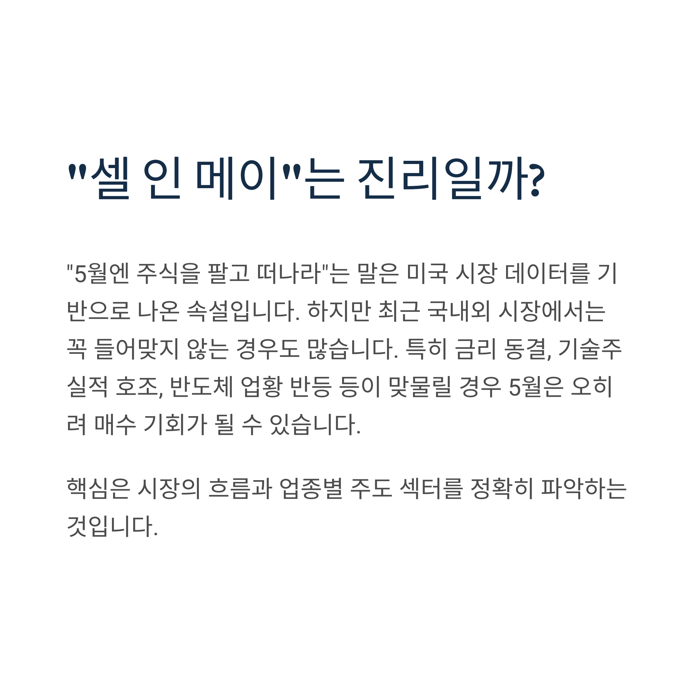 5월은 전통적으로 "셀 인 메이(Sell in May)"라는 주식 격언이 떠오르는 시기입니다.