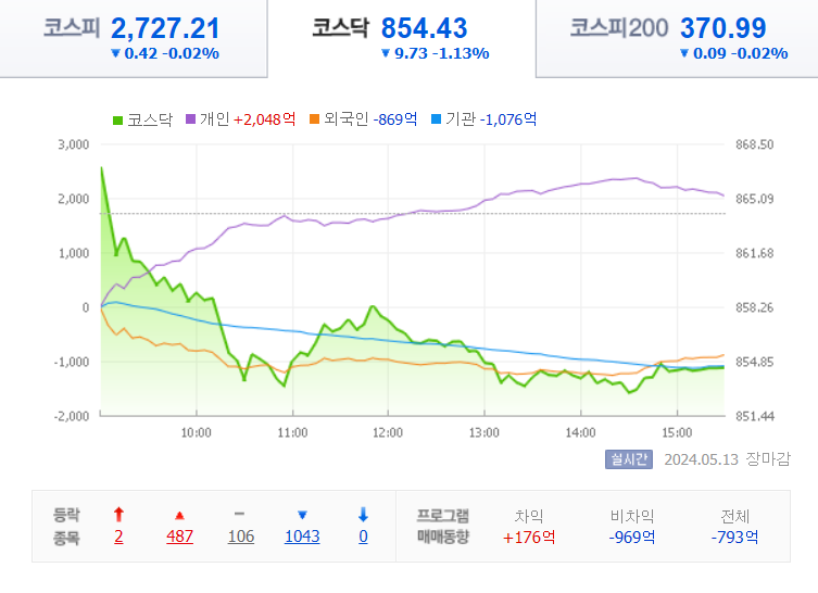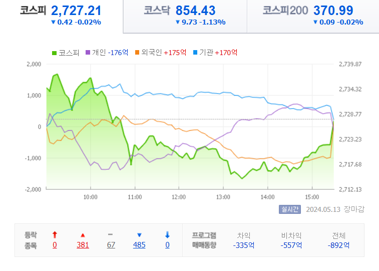 코스피 지수는 0.42(0.02%) 하락하면서 2727.21로 장을 마쳤습니다.