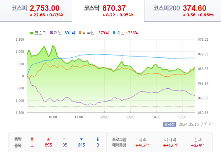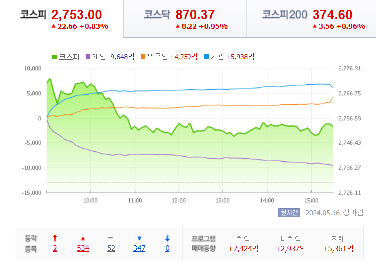 오늘 코스피 지수는 22.66(0.83%) 상승하면서 2753으로 마감을 했습니다.