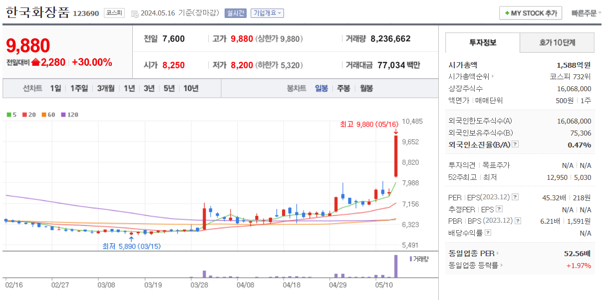 한국화장품제조가 먼저 상한가를 갔고 이종목도 이어서 상한가 마감을 했습니다.