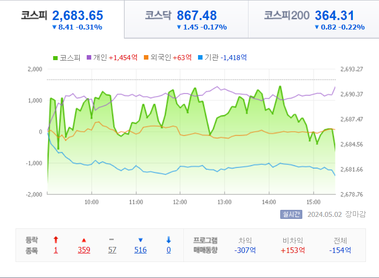코스피 지수는 전날보다 8.41(0.31%) 하락한 2683.65로 마감을 했습니다.