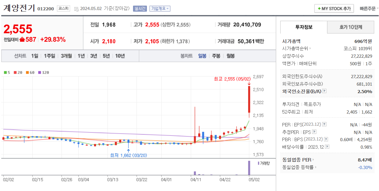 [특징주] 계양전기, 거래량 34배 폭증에 4거래일 연속 주가↑...배경은?