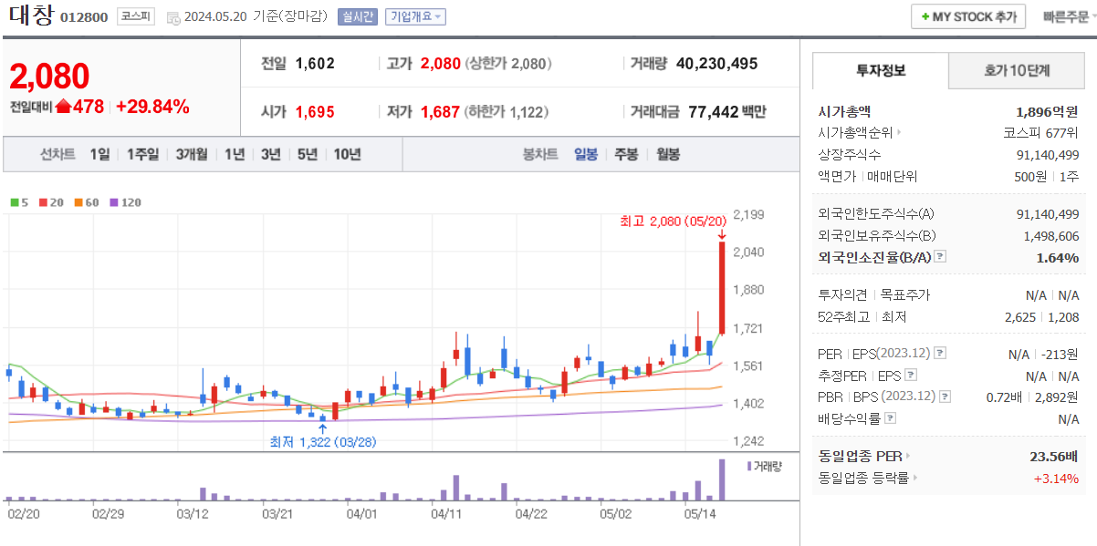 관련주인 대창,서원,국일신동,이구산업 등이 큰 폭으로 상승 마감을 했습니다.