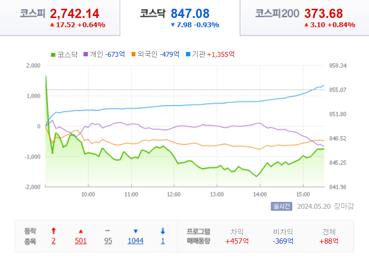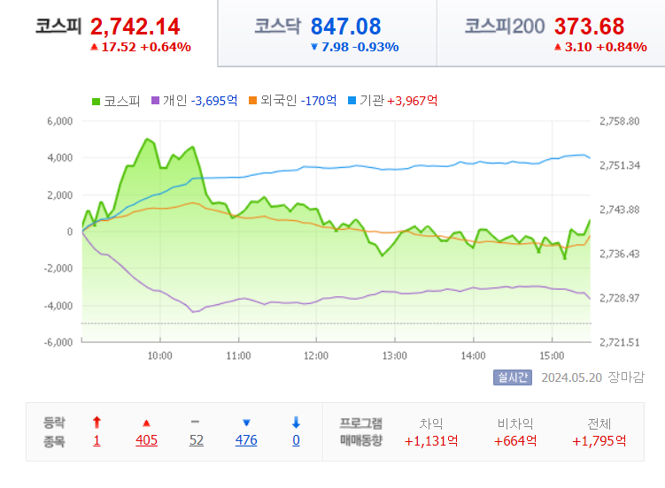 코스피 지수는 전날보다 17.52(0.64%) 상승하면서 2741.24로 마감을 했습니다.