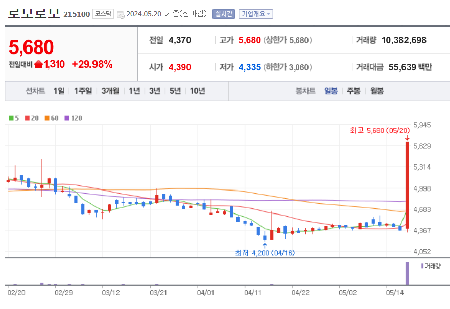 나왔습니다. 현재 로봇섹터가 좋지 않지만 미국 빅테크 기업과 협업 이슈가 크기 때문에 좀 더 상승 가능성은