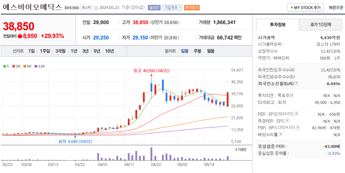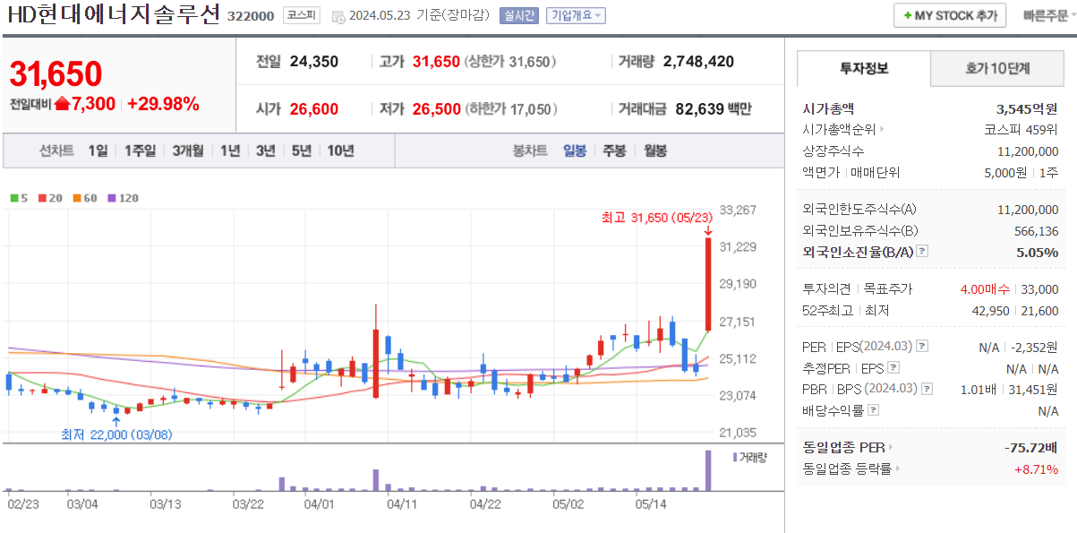 오늘 시초가는 31,000원으로 시작해서 287.86% 상승하면서 54,300원으로 마감을 했습니다.