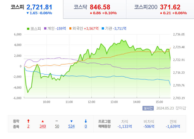 코스피 지수는 전날보다 1.65(0.06%) 하락하면서 2721.81로 장을 마쳤습니다.