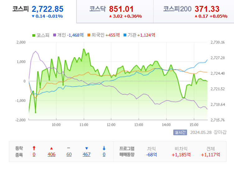 코스피 지수는 전날 보다 0.14(0.01%) 하락하면서 2722.85로 장을 마쳤습니다.