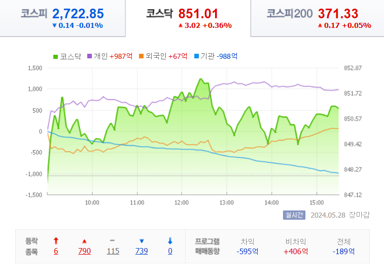 코스닥 지수는 하락과 상승을 반복하다가 외국인과 개인의 순매수의 힘입어 소폭 상승마감을 했습니다.